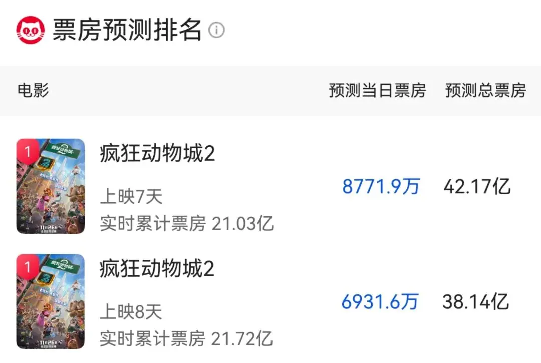 预测的涨势也是戛然而止了,一夜之间,《疯狂动物城2》总票房预测从42亿降到38亿,一下子就缩水了4亿。