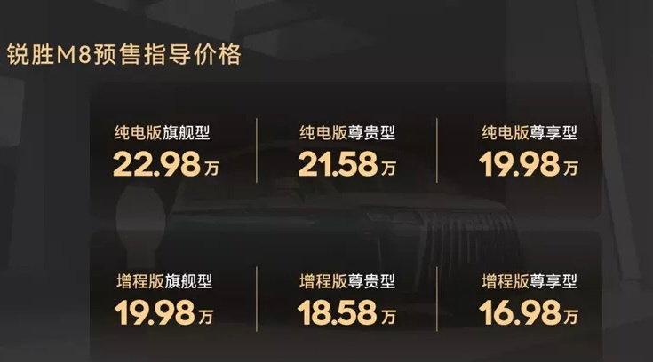 11月5日,北京汽车制造厂锐胜M8开启预售,共推出6款车型,预售价16.98-22.98万。
