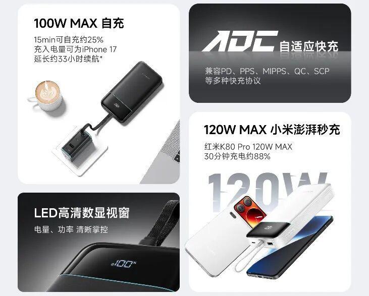 充电也上到 120W 快充,兼容 PD、PPS、MIPPS、QC、SCP 等主流快充协议,能智能匹配 100W、83W、40W 等功率。